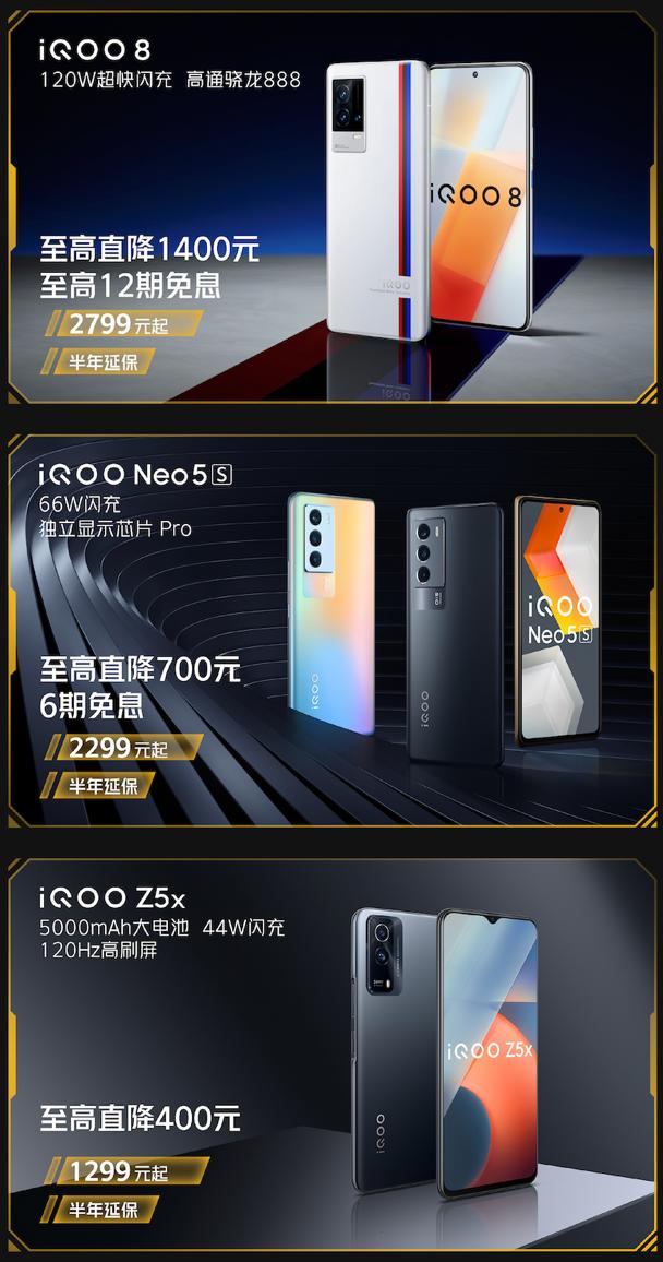 這次618預售,iQOO Z5最高直降500元,僅1449元起,并有3期免息福利、贈送半年延保。另外,iQOO Z5X最高直降400元,僅1299元起;iQOO Nei 5S 最高直降700元,僅2299元起,并有6期免息福利、贈送半年延保。