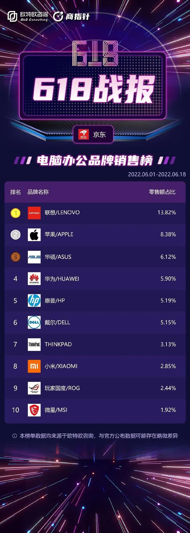 電腦辦公一直是京東的優(yōu)勢行業(yè),今年6·18期間零售額同比增長12.71%。其中,“游戲本”依舊是電腦辦公領域的核心增長點,主營游戲本的玩家國度和微星都躋身零售額TOP10榜單;兼顧游戲本發(fā)展的華碩、華為、惠普和戴爾等品牌游戲本也是其零售額最高的產(chǎn)品;而蘋果和Thinkpad則沒有乘上“游戲本”的東風。