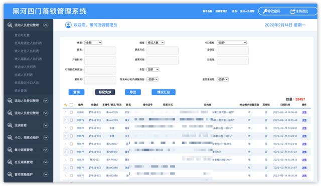 為助力政府疫情防控工作,黑河移動公司黨委自主研發(fā)“四門落鎖”系統(tǒng)迅速投入使用,目前已經覆蓋了兩站一場8個出入城交通卡口,通過信息化手段實現抵返人員管控線上化、系統(tǒng)化、閉環(huán)化,風險人員信息實時投送流轉至社區(qū);解決進出城人員登記信息流轉的需求,避免了線下數據流轉慢、人力消耗大、數據不準確易丟失等問題;同時,在試點小區(qū)卡口配套安裝中國移動千里眼監(jiān)控,實現了遠程監(jiān)管。自2021年8月至今四門落鎖系統(tǒng)抵返登記人員92369人次,抵返登記車輛66280輛次;系統(tǒng)推送流轉107652人次。