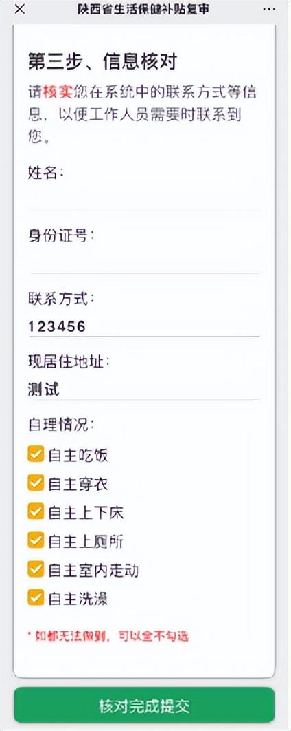 第三步 信息核對(duì);根據(jù)自身情況,完善界面顯示的信息后,點(diǎn)擊“核對(duì)完成提交”