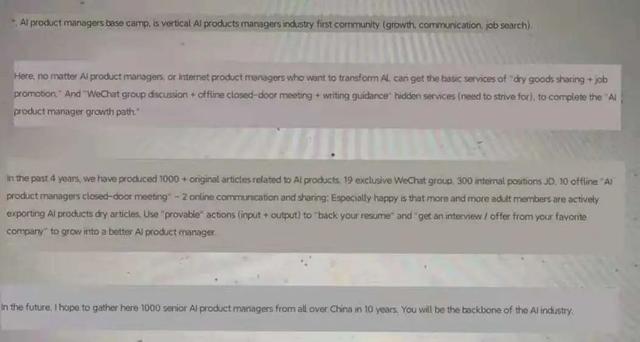 過去近4年里,我們已經(jīng)沉淀出1000+篇AI產(chǎn)品相關(guān)原創(chuàng)文章,19個(gè)專屬微信群、300+個(gè)內(nèi)推職位JD、10場線下“AI產(chǎn)品經(jīng)理閉門會(huì)”、2場線上交流分享;特別開心的是,有越來越多的成員們?cè)谥鲃?dòng)輸出AI產(chǎn)品干貨文章,用“可舉證”的行動(dòng)(輸入+輸出)來“給自己(簡歷)背書”、“拿到心儀公司的面試/offer機(jī)會(huì)”,逐漸成長為更好的AI產(chǎn)品經(jīng)理。
