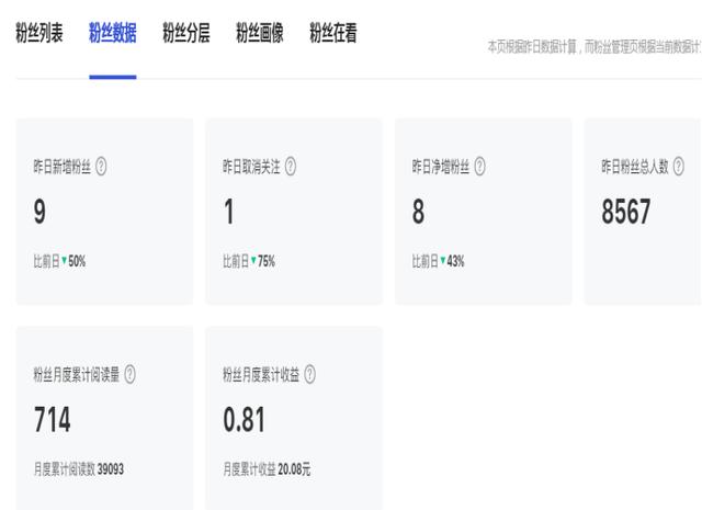 粉絲數(shù)據(jù)主要包含:總粉絲數(shù)、新增粉絲、取消關(guān)注、凈增粉絲、粉絲月度閱讀量和粉絲月度累計(jì)收益。