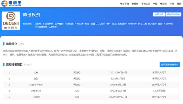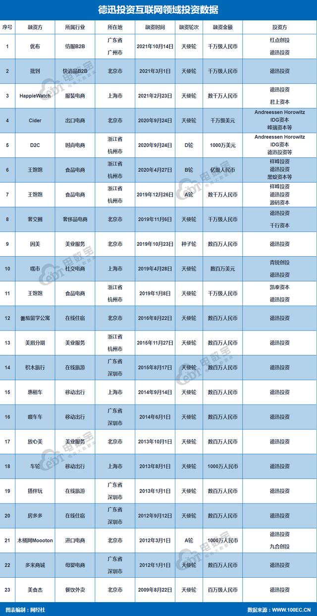 據(jù)網(wǎng)經(jīng)社“電數(shù)寶”(DATA.100EC.CN)大數(shù)據(jù)庫顯示,2009年8月至2021年10月,德迅投資累計參與了23起互聯(lián)網(wǎng)領域的投資,涉及公司分別為:優(yōu)布、批到、HappieWatch、Cider、D2C、王飽飽、奢交圈、因美、嘿市、番茄留學公寓、美眉分期、積木旅行、惠租車、喂車車、放心美、車輪、搭伴玩、房多多、木桶網(wǎng)Moooton、多米商城、美食杰。