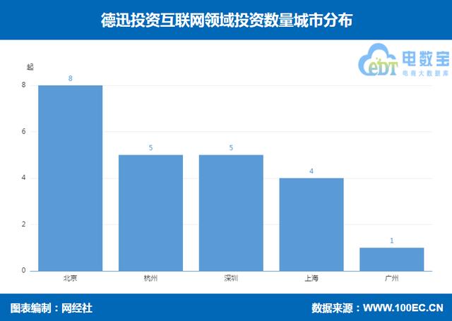 城市分布上,德迅投資在北京投資次數(shù)最多,為8起;其次是杭州和深圳,各5起;上海為4起;廣州為1起。