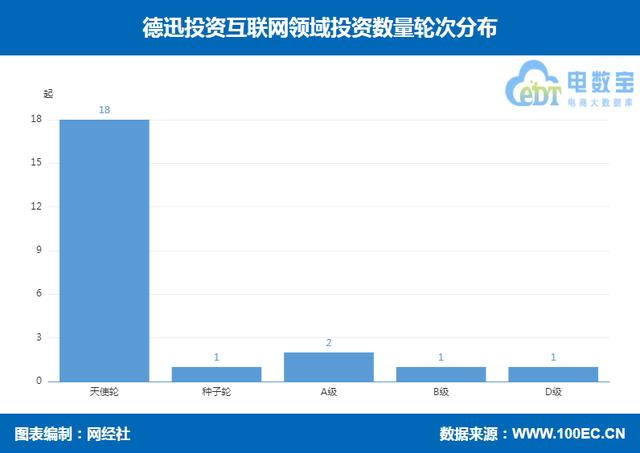 數(shù)據(jù)統(tǒng)計發(fā)現(xiàn),在德迅投資的投資中,投資次數(shù)最多的是天使輪,為18起;其次是A級,為2起;種子輪、B級和D級各1起。