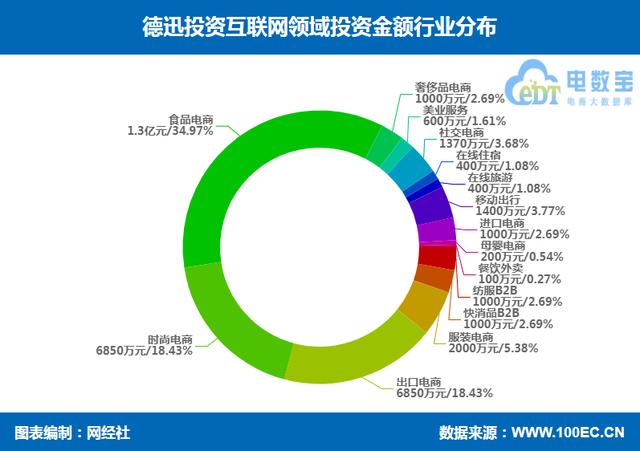 從投資的行業(yè)分析,德迅投資超三成投資在食品電商,金額為1.3億元;其次是時尚電商和出口電商,各為6850萬元;社區(qū)團購為5.48億元;服裝電商為2000萬元;移動出行為1400萬元;社交電商為1370萬元;奢侈品電商、進口電商、紡服B2B、快消品B2B,各1000萬元;美業(yè)服務為600萬元;在線住宿和在線旅游各400萬元;母嬰電商為200萬元。