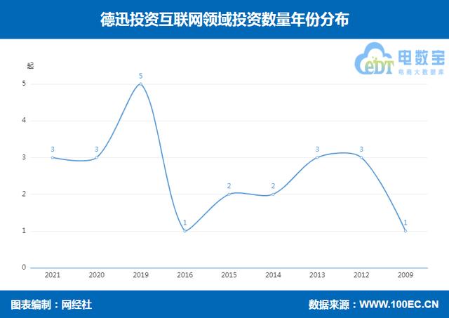 在年份分布上,德迅投資2019年投資次數(shù)最多,為5起;其次是2021年、2020年、2013年和2012年,各3起;2015年和2014年各2起;2016年和2009年各1起。