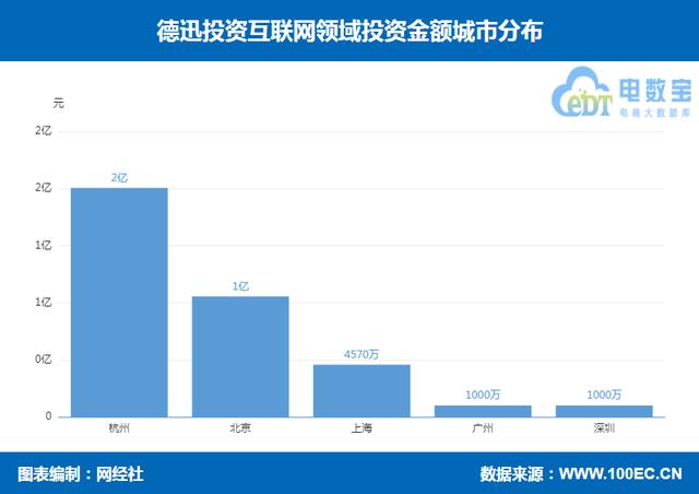融資金額城市分布上看,德迅投資在杭州投資最多,為2億元;其次是北京,投資了1億元;上海4570萬元;廣州和深圳各1000萬元。