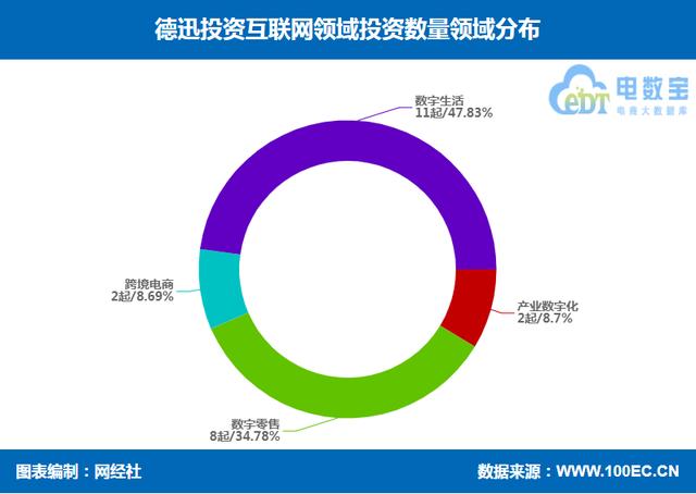 在互聯(lián)網(wǎng)領域中,德迅投資最青睞的是數(shù)字生活,共11起,占比47.83%;其次是數(shù)字零售,共8起;產(chǎn)業(yè)數(shù)字化和跨境電商各2起。