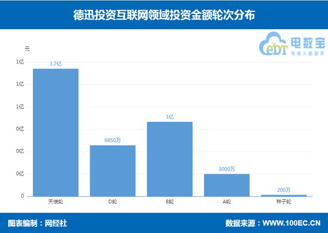 數(shù)據(jù)顯示,在德迅投資的投資中,投資金額最多的是天使輪,投資金額為1.7億元;其次是B輪,投資金額為1億元;D輪投資金額為6850萬元;A輪投資金額為3000萬元;種子輪為200萬元。