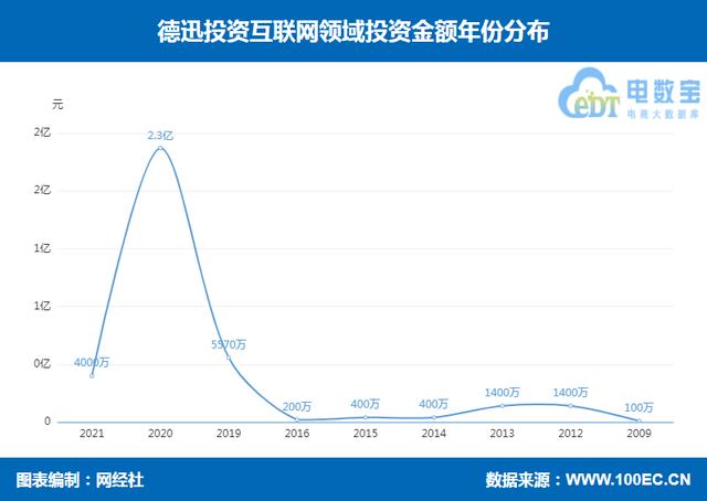 在投資金額年份中,德迅投資2020年投資金額最多,為2.3億元;其次是2019年,5570萬元;2021年為4000萬元;2013年和2012年各1400萬元;2015年和2014年各400萬元;2016年為200萬元;2009年為100萬元。