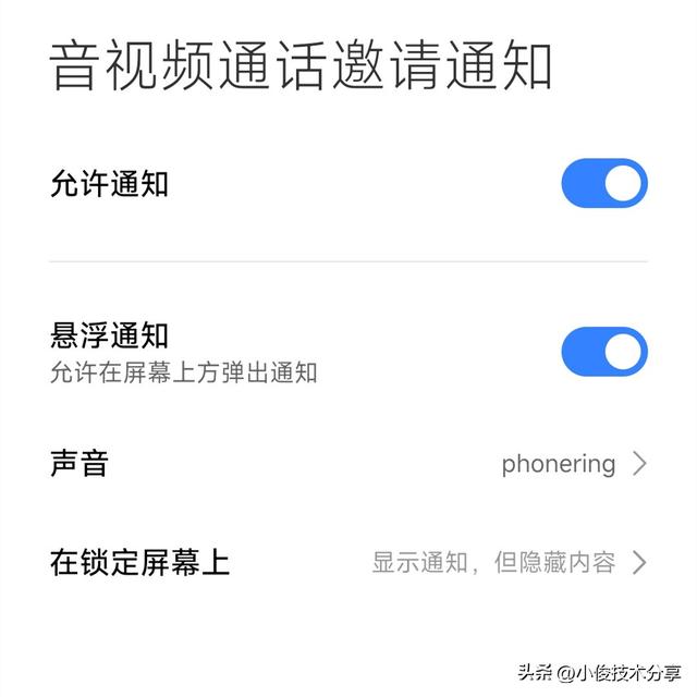 接下來,請點(diǎn)擊下方的【音視頻通話邀請通知】選項(xiàng),并確保將【允許通知】和【懸浮通知】這兩個(gè)開關(guān)都開啟,如下圖所示!