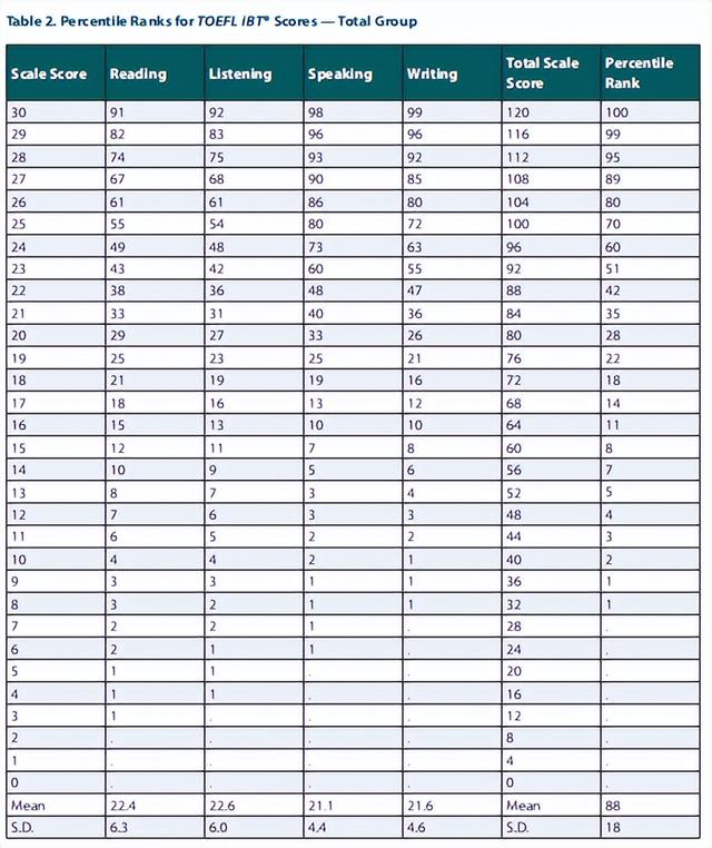 2021年,全球托??忌骄衷贊q1分,由87分升到了88分,其中閱讀22.4分、聽(tīng)力22.6分、口語(yǔ)是21.1分、寫作21.6分。