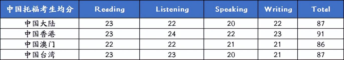 如果按母語(yǔ)來(lái)看,母語(yǔ)是中文的考生(包含中國(guó)香港、中國(guó)澳門、中國(guó)臺(tái)灣以及美高中國(guó)學(xué)生),2021年托福平均成績(jī)也是87分。