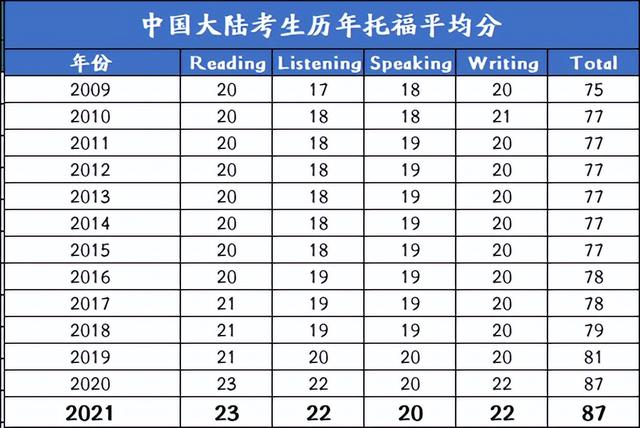 報(bào)告顯示,2021年中國(guó)大陸托??忌钠骄煽?jī)與2020年持平,仍為87分。其中,閱讀23和聽(tīng)力22沒(méi)有變化,但口語(yǔ)平均分20分,下滑1分;寫作平均分達(dá)到近10年新高22分。