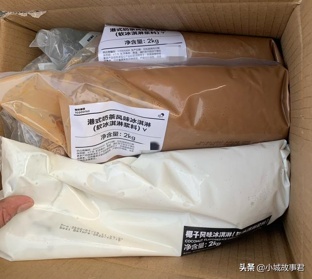 照片中是幾包喜茶的原料,其中有軟冰淇淋漿料:“港式奶茶風(fēng)味冰淇淋”、“椰子風(fēng)味冰淇淋”……還有幾包果凍:“膠原蛋白脆波波”、“桂花凍”……