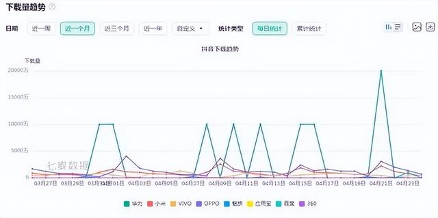 據(jù)七麥數(shù)據(jù)顯示,4月21日當天抖音安卓客戶端下載量達到了近一個月內(nèi)的下載峰值,其中華為手機的下載量甚至超以往的兩倍。