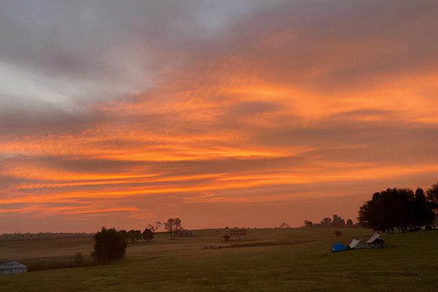 一直玩到感覺腳下的大地在微微浮動。突然夕陽打了一個響指,山坡上的天空成了一整塊軟撲撲的巨大橘紅色磨砂玻璃,四周的綠野上亮起了燈火,瞇上眼睛看會覺得是星星被抖落到了草地。