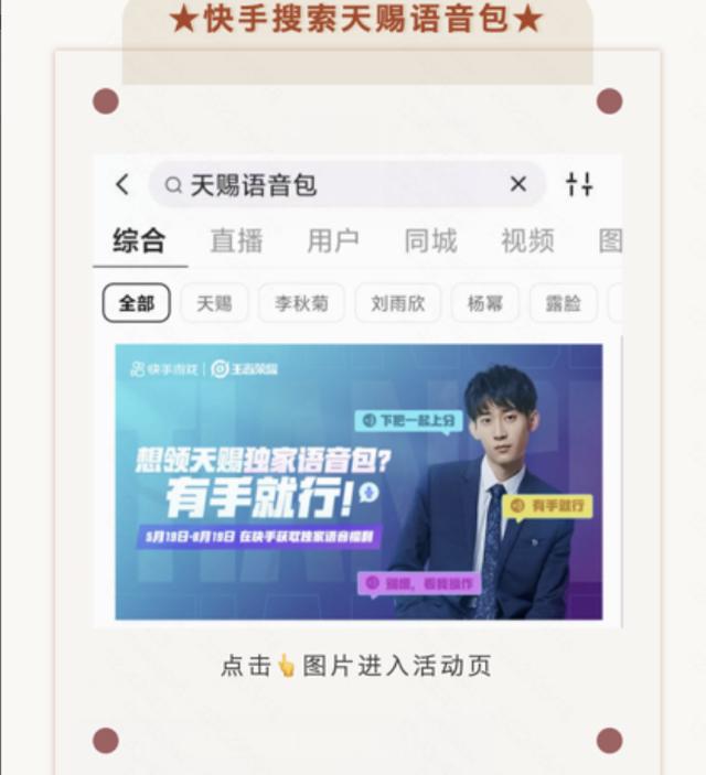 而天賜獨家語音包也十分符合他的個人特點,內(nèi)容分別為:“別慌看我操作”、“有手就行”、“下把一起上分”。如果想要獲得天賜的專屬語音包,玩家們不妨去快手搜索“天賜語音包”,點擊上述圖片進入活動頁面。隨后我們只需要關(guān)注天賜,便可以免費獲得“下把一起上分”和“有手就行”這兩款的語音包。至于“別慌,看我操作”這款語音包需要我們觀看一分鐘他的直播,經(jīng)過上述操作便能夠集齊全套語音包了。