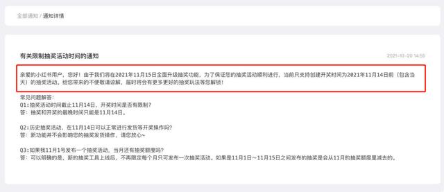 早在10月20日,小紅書就在企業(yè)號(hào)后臺(tái)發(fā)布限制抽獎(jiǎng)活動(dòng)時(shí)間的通知。通知里明確寫明11月15日抽獎(jiǎng)工具升級(jí),由此可見,抽獎(jiǎng)功能調(diào)整已經(jīng)做實(shí)。因?yàn)樵谥?,小紅書平臺(tái)限制個(gè)人與品牌的抽獎(jiǎng)規(guī)則,企業(yè)號(hào)一個(gè)月只能抽獎(jiǎng)1次;個(gè)人號(hào)完全不能抽獎(jiǎng)。