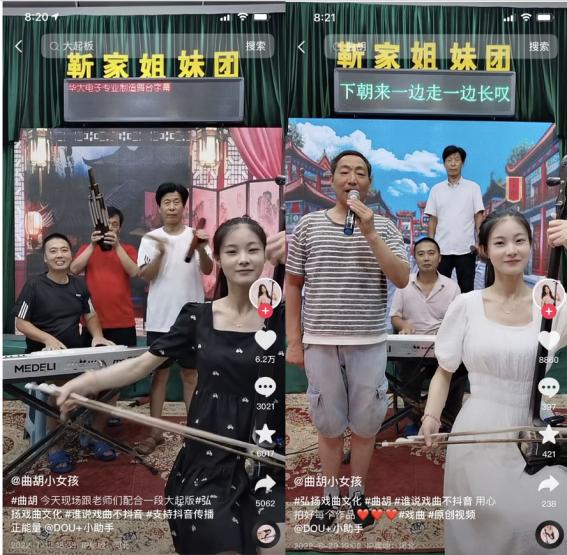 把家庭劇團搬進抖音直播間的靳楠楠,可以說迎來了自己事業(yè)的第二春,也掀開了傳承傳統(tǒng)文化、民間曲藝的新篇章。以前線下演出,門票收入是他們的主要收入來源,而現(xiàn)在,直播間成了他們更大的舞臺,觀眾的打賞則成了民樂線上演出的門票。而這種時候,大家也才發(fā)現(xiàn),即便是像曲胡這種多數(shù)人以前聽都沒有聽過,更別說見過的小眾化樂器,一旦站在了直播間這樣的時代新舞臺上,也會找到無數(shù)的擁躉和知音。而靳楠楠也在不斷地調(diào)整自己,以便更加適應(yīng)短視頻和直播平臺傳播的規(guī)律和觀眾的喜好,所以她在努力學(xué)習(xí),精進自己演奏技藝的同時,也主動尋求與平臺其他主播的合作,從而擴大了自己的影響,讓更多人看到了自己的演奏,了解了曲胡,了解了民間曲藝。