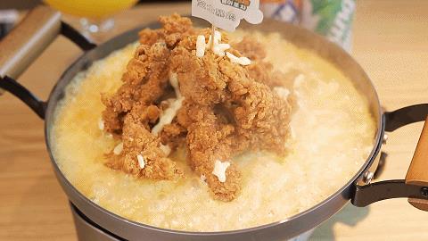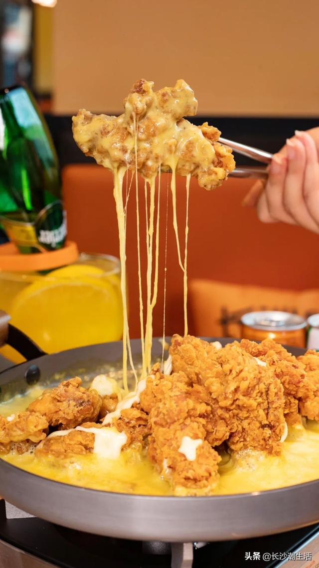 厚厚的芝士打底,堆成小山的炸雞,配上小爐加熱,不一會(huì)芝士就開(kāi)始滋啦滋啦融化,用炸雞裹滿一圈芝士,拉絲的沖擊效果絕了!