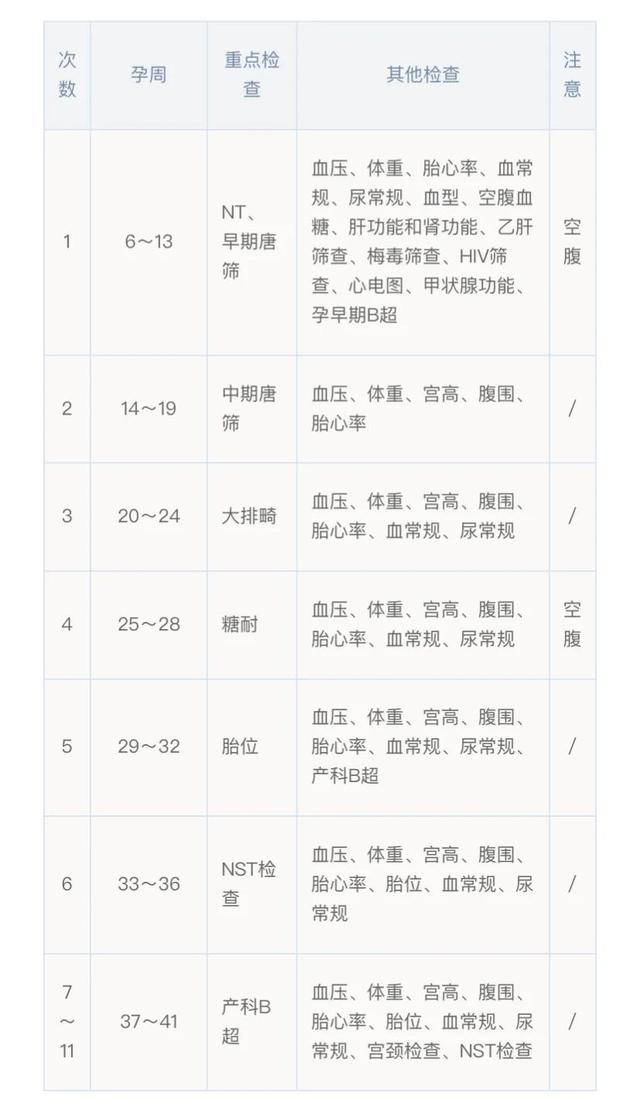 下表按照時(shí)間整理了孕期要做的檢查,你可以收藏起來備用: