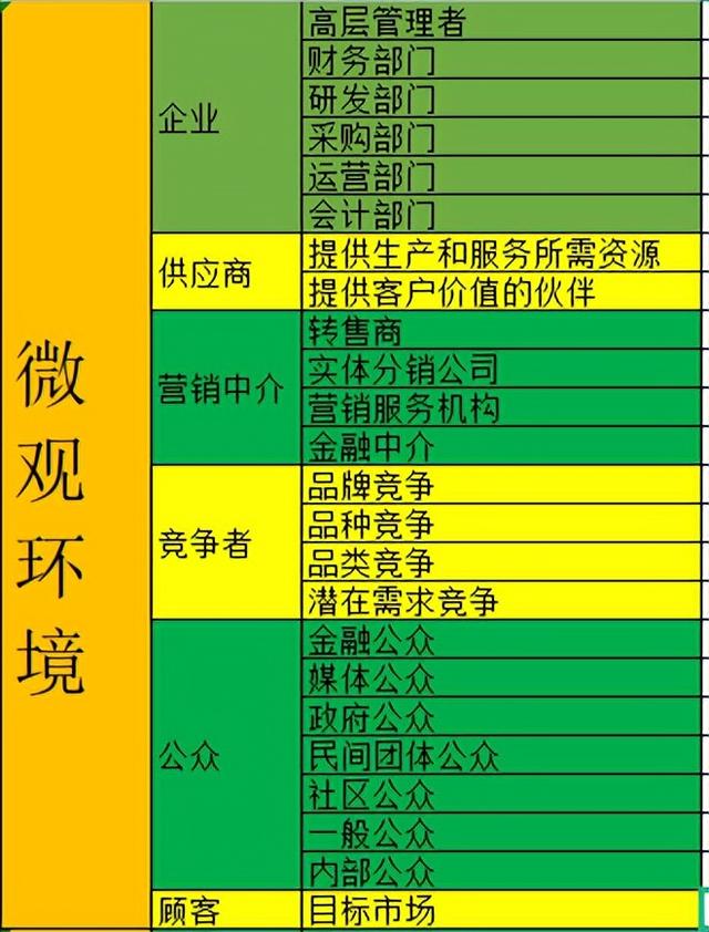 企業(yè)微觀環(huán)境是指能夠?qū)ζ髽I(yè)服務(wù)其目標(biāo)的營銷能力構(gòu)成直接影響的各種因素的集合,對企業(yè)的營銷能力構(gòu)成直接的影響,直接影響與制約著企業(yè)的營銷行為,與企業(yè)具有或多或少的經(jīng)濟(jì)聯(lián)系,也被稱作直接營銷環(huán)境。