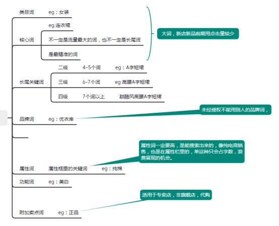關(guān)鍵詞可以分類目詞、核心詞、長尾關(guān)鍵詞、品牌詞、屬性詞、功能詞、附件賣點詞。