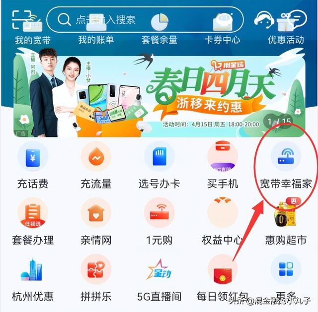 得,趕緊打開移動(dòng)掌廳APP,找到家庭寬帶服務(wù)“寬帶幸福家”。