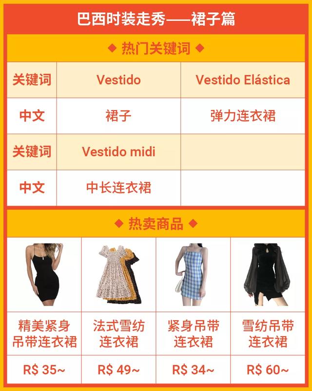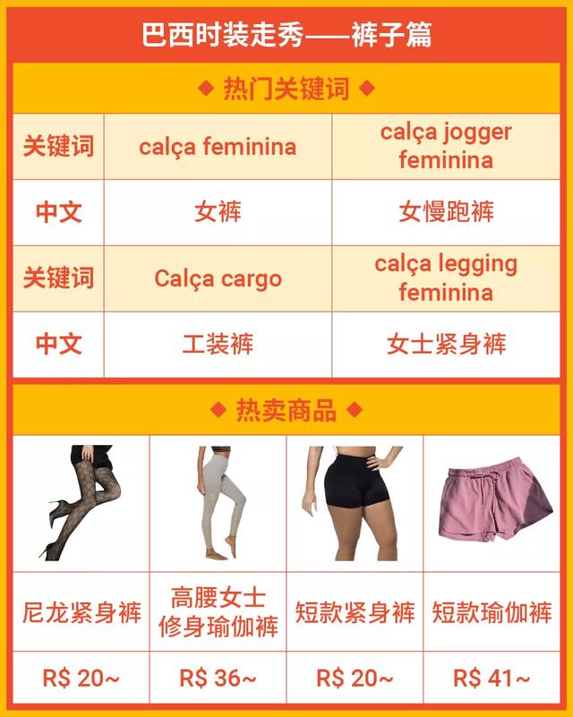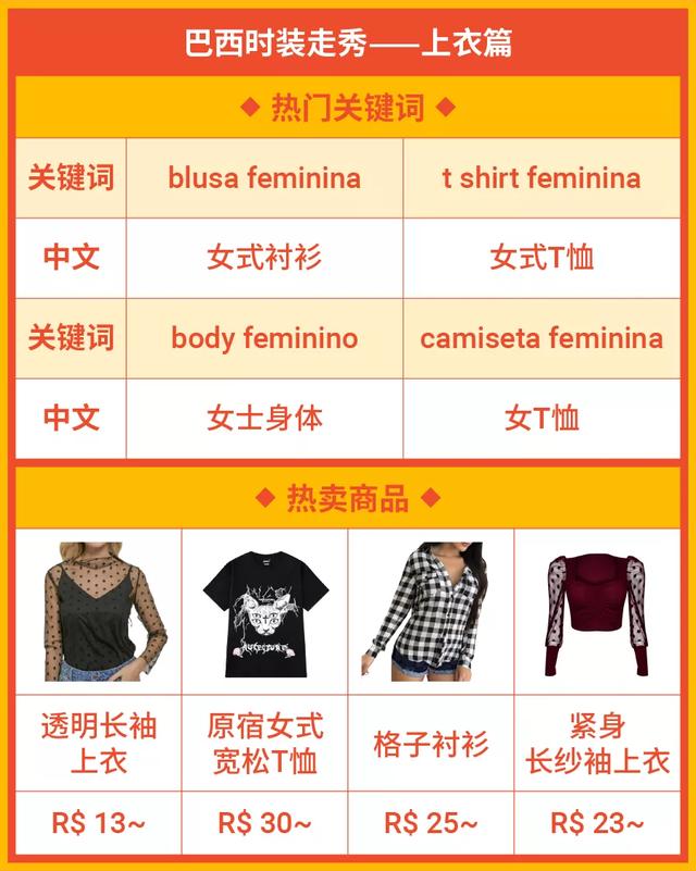 掌握了巴西旺季女裝的熱賣時(shí)機(jī)和特別需要注意的尺碼表,下面給大家看看各各子類目的熱賣品哈,從上衣到褲子全身裝備,方便大家抓住流行趨勢,實(shí)現(xiàn)旺季爆單。