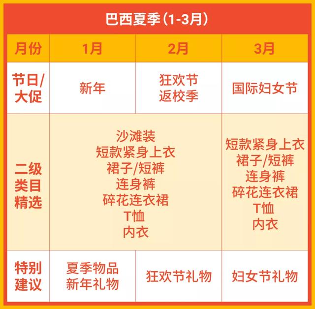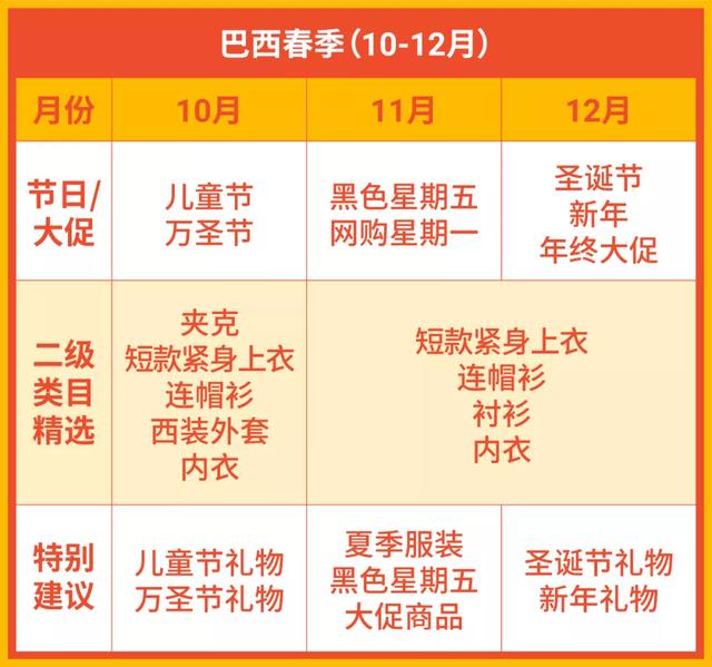 巴西的季節(jié)與我們是相反的,10月份他們開始進(jìn)入了春天,緊接著就是夏天。各位巴西市場的賣家可以開始準(zhǔn)備春夏季的服裝大潮,提前上新季節(jié)性商品。