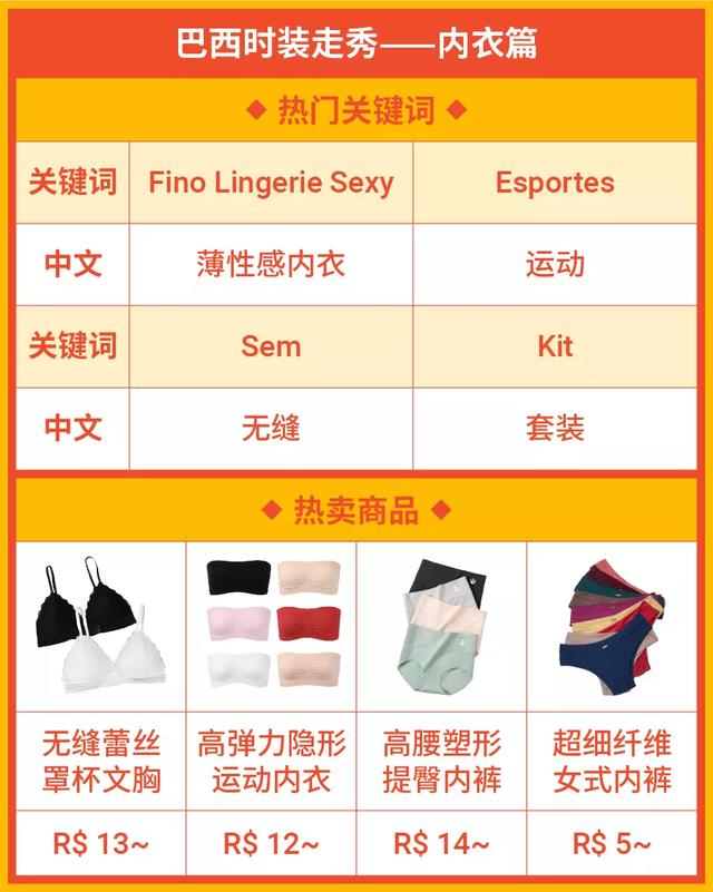 內(nèi)衣產(chǎn)品在巴西市場也十分受歡迎,各位賣家朋友也可以多多關(guān)注這類產(chǎn)品哈,此外,賣家朋友們還需要關(guān)注巴西女孩的身材特征,提供量身定制的尺碼表特別重要。