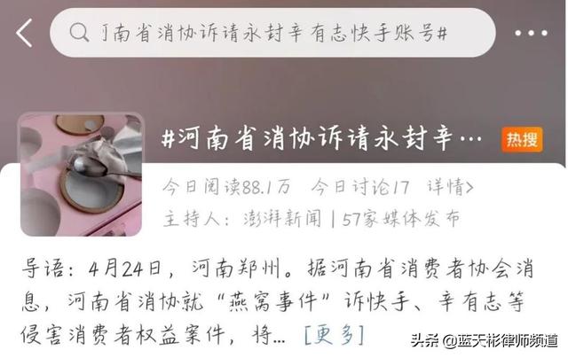 根據(jù)4月24日澎湃新聞的報道,河南省消協(xié)就“燕窩事件”訴快手、辛有志等侵害消費者權(quán)益案件將于5月9日開庭。訴請包括退賠、永封辛有志快手賬號等。