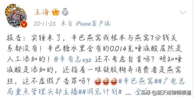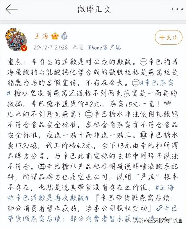 12月7日,王海再次微博發(fā)聲,稱辛巴的道歉是對公眾的欺騙。
