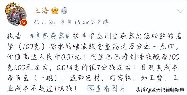 隨后王海轉(zhuǎn)發(fā)該聲明并評論道:“茗摯(100克)糖水的唾液酸含量高達萬分之一點四,價值高達人民幣0.07元!”