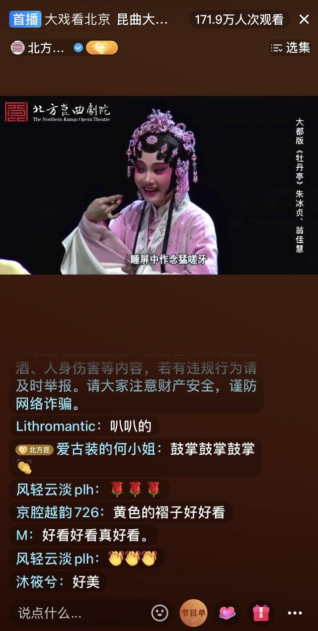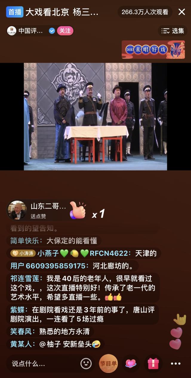 2022年6月2日至11日,抖音直播聯(lián)合中國文促會戲曲文化專業(yè)委員會推出“大戲看北京 云端演出周”活動,累計吸引超過9067萬人次線上看大戲。包括國家京劇院、北京京劇院、北方昆曲劇院、中國評劇院、北京市曲劇團(tuán)、北京市河北梆子劇團(tuán)等在內(nèi)的12家劇院機(jī)構(gòu),連續(xù)10天通過抖音直播間展播《霸王別姬》《牡丹亭》《西廂記》《狀元媒》《茶館》等經(jīng)典大戲,覆蓋京劇、昆曲、黃梅戲、越劇、曲劇、評劇等劇種,讓萬千戲迷大飽眼福。