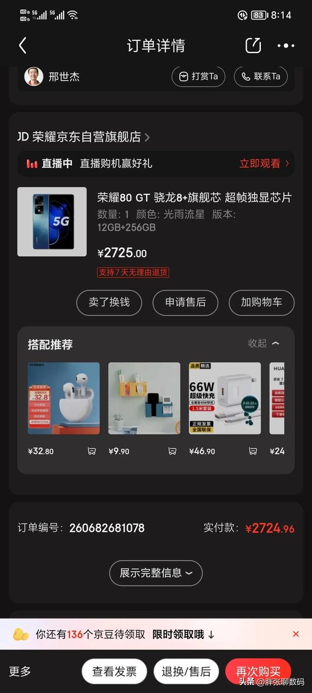 這個(gè)是我購買的訂單,當(dāng)時(shí)以2725的價(jià)格購入,本來手機(jī)到手很高興,使用體驗(yàn)也很好。沒想到4天后京東百億補(bǔ)貼加大了力度比3.8節(jié)的的時(shí)候價(jià)格還低