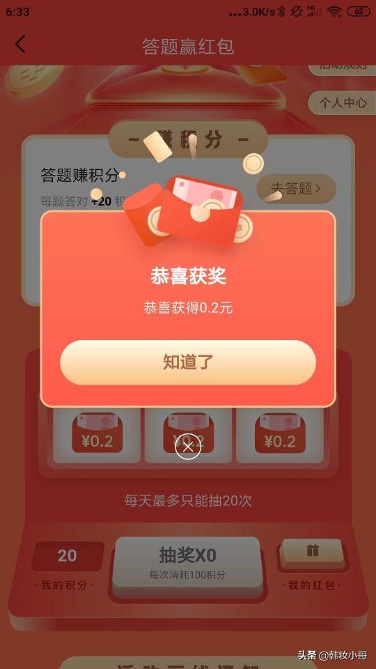 答題非常的簡單,10個(gè)字以上就可能通過,不用寫太多,每通過一道題,20個(gè)積分,100個(gè)積分,就可以抽一次獎(jiǎng)了。獎(jiǎng)金大小不等,最小的是一毛,最大的是100,但是我抽的大多數(shù)都是0.1元,0.2元,0.3元。