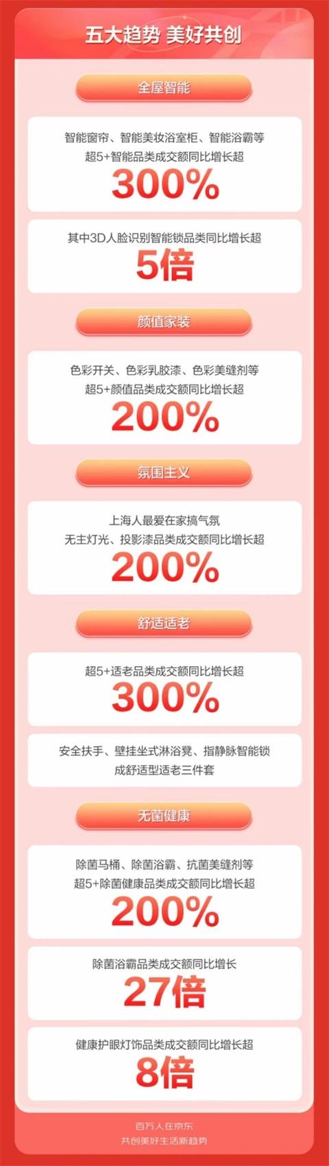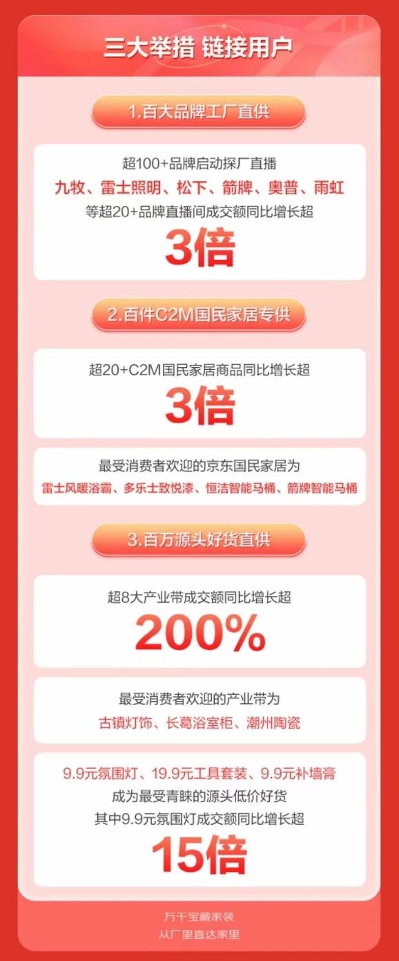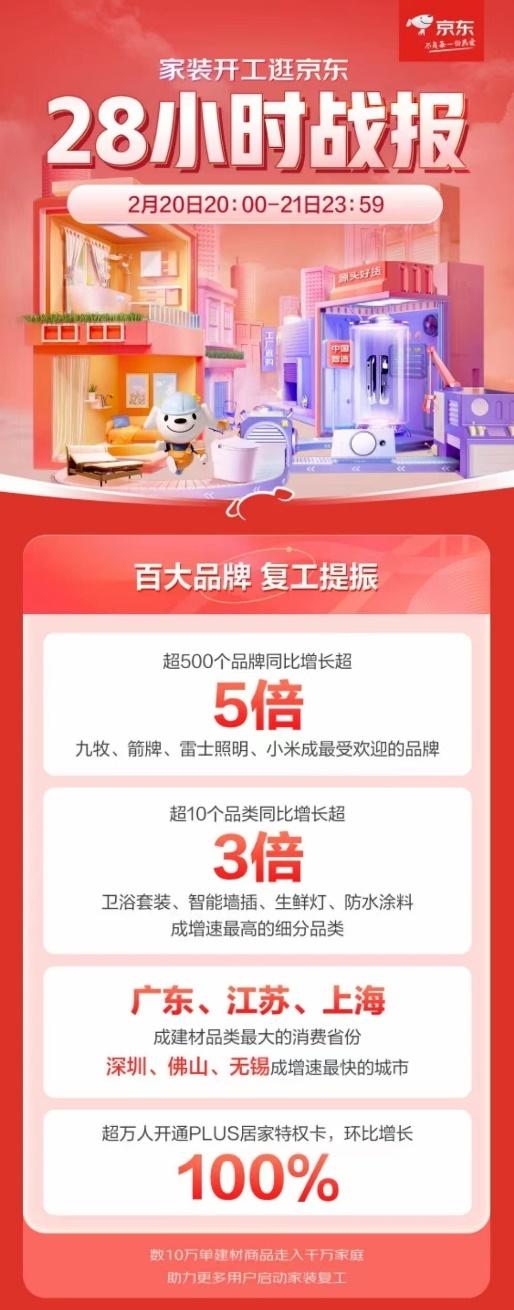 ]]>在家裝開工季前期,京東有關(guān)“家裝一站式、極簡門、微水泥瓷磚、臥室收納、客廳氛圍裝飾、隱藏式晾衣機、電動功能沙發(fā)、健康護脊床墊”等關(guān)鍵詞的搜索熱度均有明顯增長。2月20日晚8點京東家裝開工季全面開啟后,消費者迅速鎖定心儀大牌,九牧、箭牌、芝華仕等超500個品牌成交額同比增長超5倍,超1000個品牌成交額同比增長超100%。京東居家聯(lián)合頭部品牌打造的超20款C2M國民家居商品成交額同比增長超 3倍,多樂士致悅抗甲醛、恒潔水玉智能馬桶、C2M網(wǎng)易嚴選星艦椅、C2M國民家居顧家家居沙發(fā)成為高人氣代表。九牧、雷士照明、芝華仕、奧普等50余個大牌開展“探廠直播”接力,讓消費者一邊“云逛”大牌工廠一邊獲得“工廠直接發(fā)貨到家”高性價比買貨體驗,觀看量超千萬,帶動成交額增長超5倍。