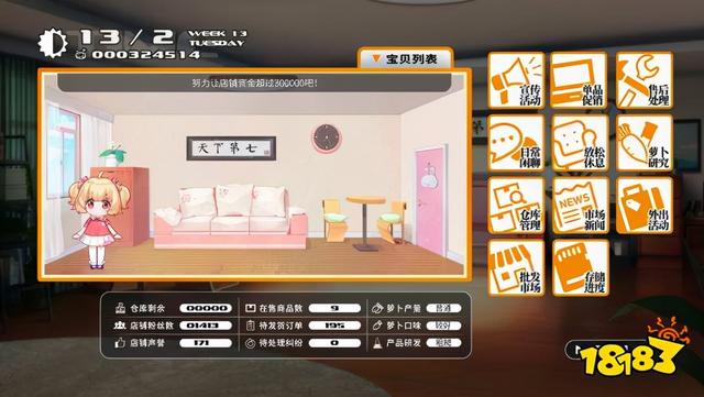 游戲的經(jīng)營元素略顯輕度,內(nèi)容不多,日常就是通過宣傳活動增加粉絲,打折促銷,研發(fā)新品和售后服務(wù)等諸多網(wǎng)店運營的操作,還有就是在各地倒買倒賣稀缺物品,關(guān)注新聞動態(tài)來實現(xiàn)利潤最大化,想對來說想法還是挺棒的,比較新穎有趣。