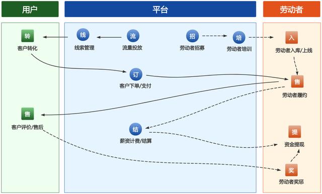 從上圖可以看出,業(yè)務(wù)主要圍繞3個角色,2條核心流程展開,1條流程代表客戶(需求),1條流程代表勞動者(供給),一句話概括就是平臺用最高效的流量成本獲取客戶需求,最小的成本拿到供給,通過自身基礎(chǔ)建設(shè)與系統(tǒng)能力,完成服務(wù)的順利交付。