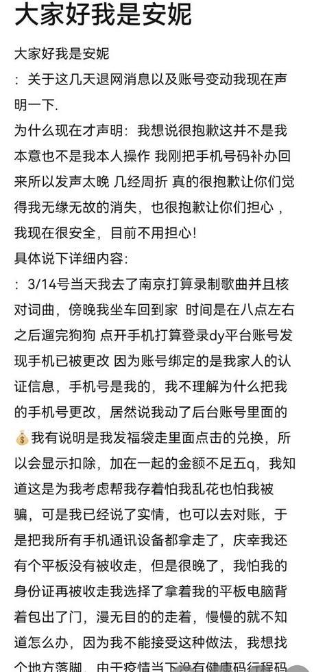 據(jù)安妮(就愛(ài)聽(tīng)復(fù)雜,家中四個(gè)女兒一個(gè)兒子)介紹稱,大約在3月14號(hào)左右,她前往南京錄制歌曲并且核對(duì)歌詞,沒(méi)想到傍晚回家打開自己的賬號(hào)發(fā)現(xiàn)手機(jī)號(hào)已經(jīng)被改正,因?yàn)橘~號(hào)綁定的是家人認(rèn)證的消息,手機(jī)號(hào)則是她自己的。