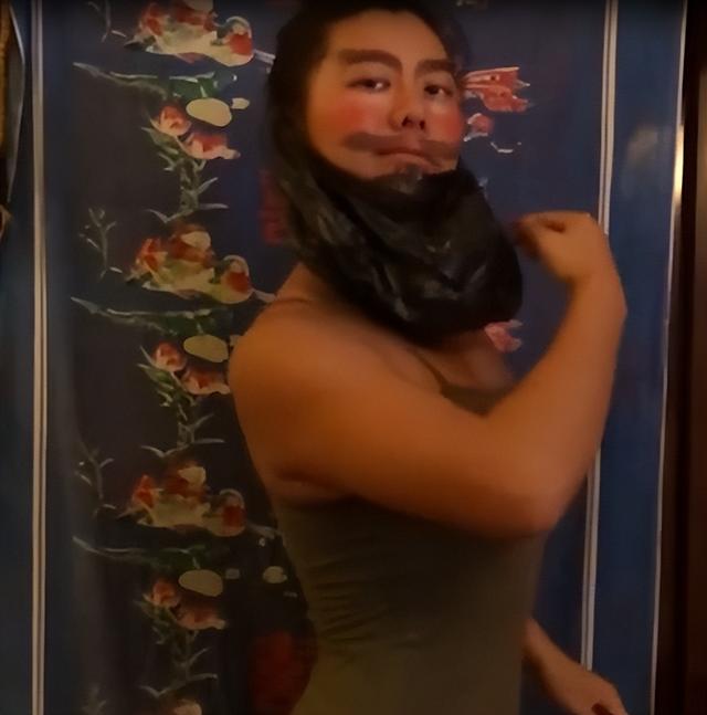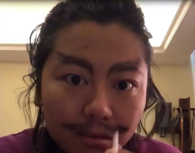 視頻中,她為自己畫上粗壯的眉毛,和茂密的胡子,甚至用黑色垃圾袋來扮演絡腮胡。