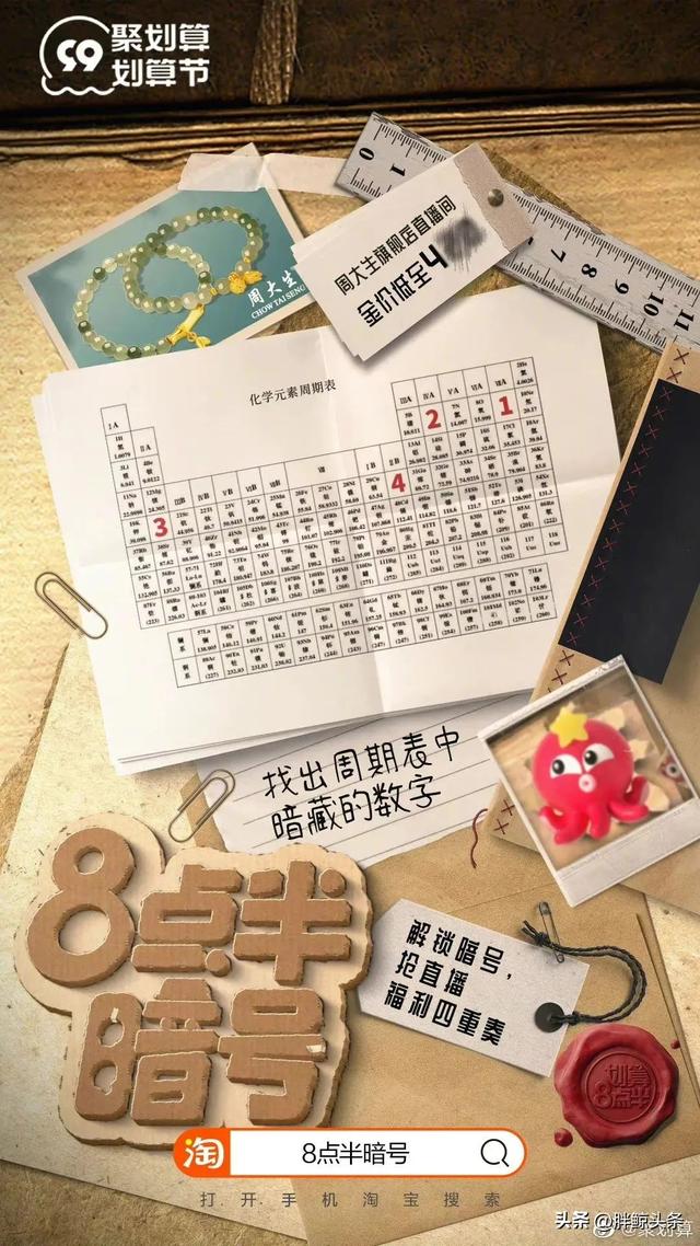 先從直播玩法上看,今年全民看直播“對(duì)暗號(hào)”玩法可謂成功引爆了一波晚8點(diǎn)半流量高峰。暗號(hào)玩法一共有8個(gè)謎題,范圍包括數(shù)學(xué)公式、甲骨文、元素周期表等,聚劃算官方聯(lián)合眾多商家共同發(fā)布暗號(hào)懸念海報(bào),用戶通過趣味化的拆解,才能找到謎底,雖然解法各不相同,但都指向了同一個(gè)謎底:09062030。