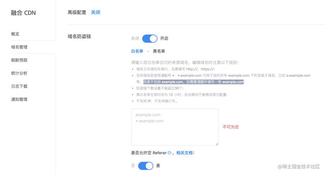 HTTP referer 是 header 上的一個屬性。當(dāng)瀏覽器向服務(wù)器發(fā)起請求時,一般會帶上Referer,告訴服務(wù)器我是從哪個頁面鏈接過來的。打個比方,我們在后臺上傳一個視頻到七牛云,七牛云高級配置里有一個域名防盜鏈選項(xiàng),我們可以在這里設(shè)置白名單和黑名單。