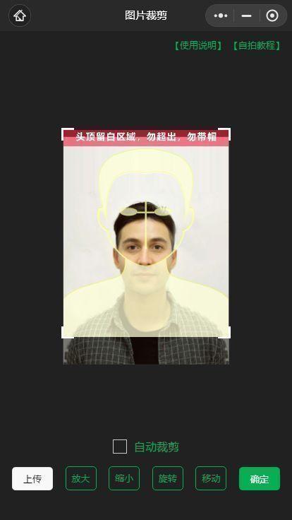 6、使用手機(jī)相機(jī)拍照,上傳后點(diǎn)擊“自動(dòng)裁剪”或手動(dòng)裁剪都可以,對照片背景沒有限制(建議在純色背景前拍照)