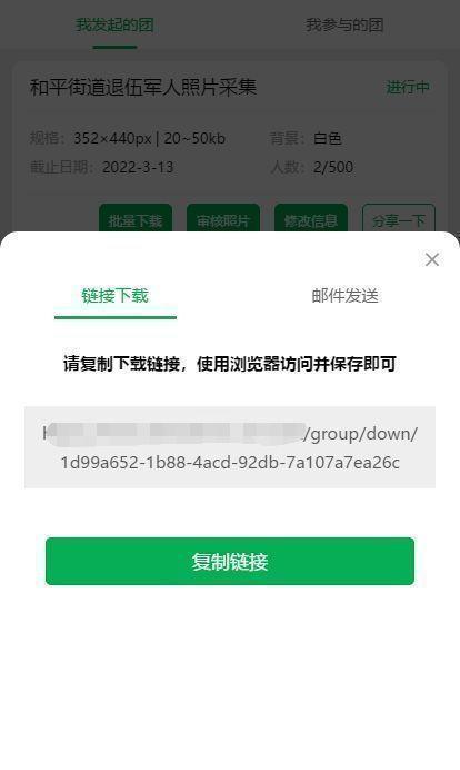 9、待所有照片采集并審核通過后,就可以下載照片了,支持打包發(fā)送到郵箱,或通過下載地址下載