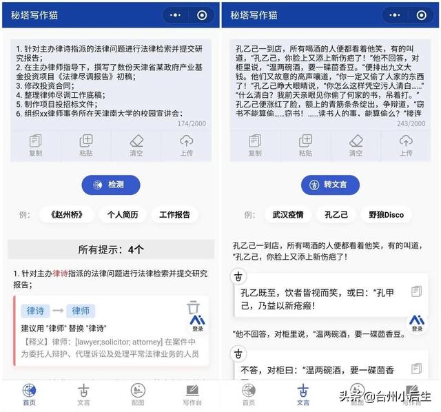 它可以自動(dòng)就幫你檢測文章里的錯(cuò)別字、語病,并且提供修改的建議。同時(shí),還有白話文轉(zhuǎn)文言文、沙雕圖自動(dòng)配圖等功能,很有趣!