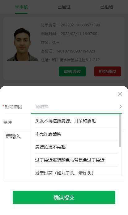 8、證件照采集發(fā)起者則可以看到當(dāng)前提交照片的情況,并且在手機(jī)端進(jìn)行審核。照片不合格的,也可以選擇不合格的原因,并且退回后重新拍照上傳。